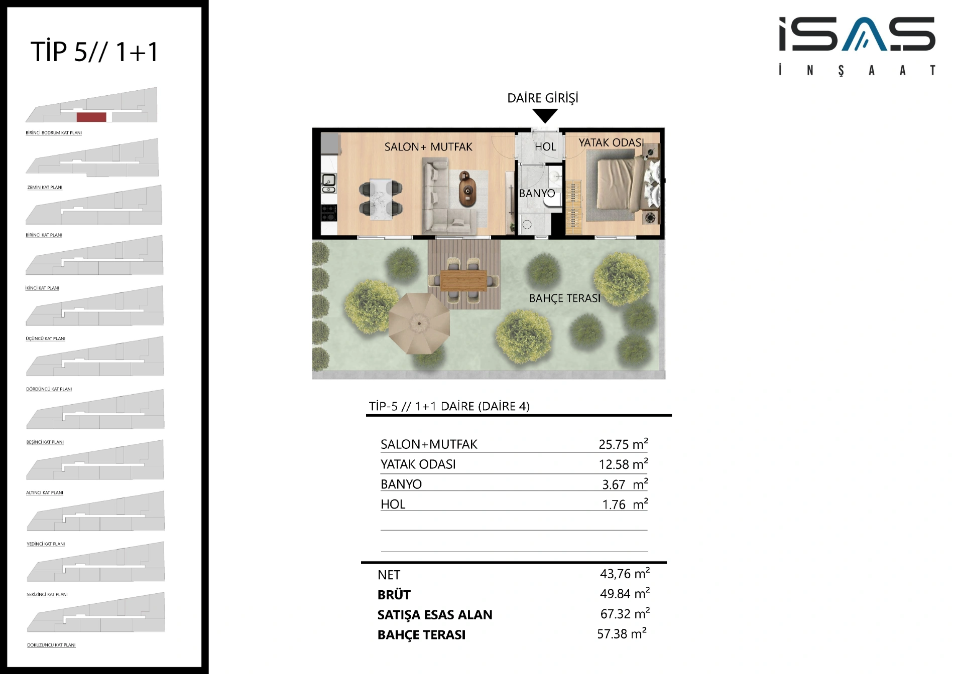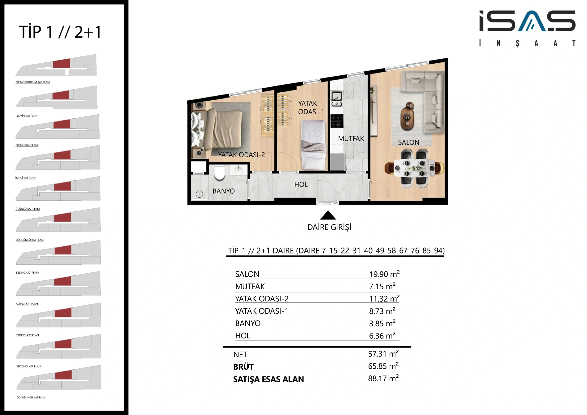 Developed on a 1,200 m² land area, the project consists of a single residential building with 11 floors. It offers well-designed 1+1 and 2+1 apartment options, with sizes ranging from 46 m² to 85 m². The residences are planned to maximize functionality, natural light, and modern living comfort, making them suitable for young professionals, small families, and rental-focused investors.
